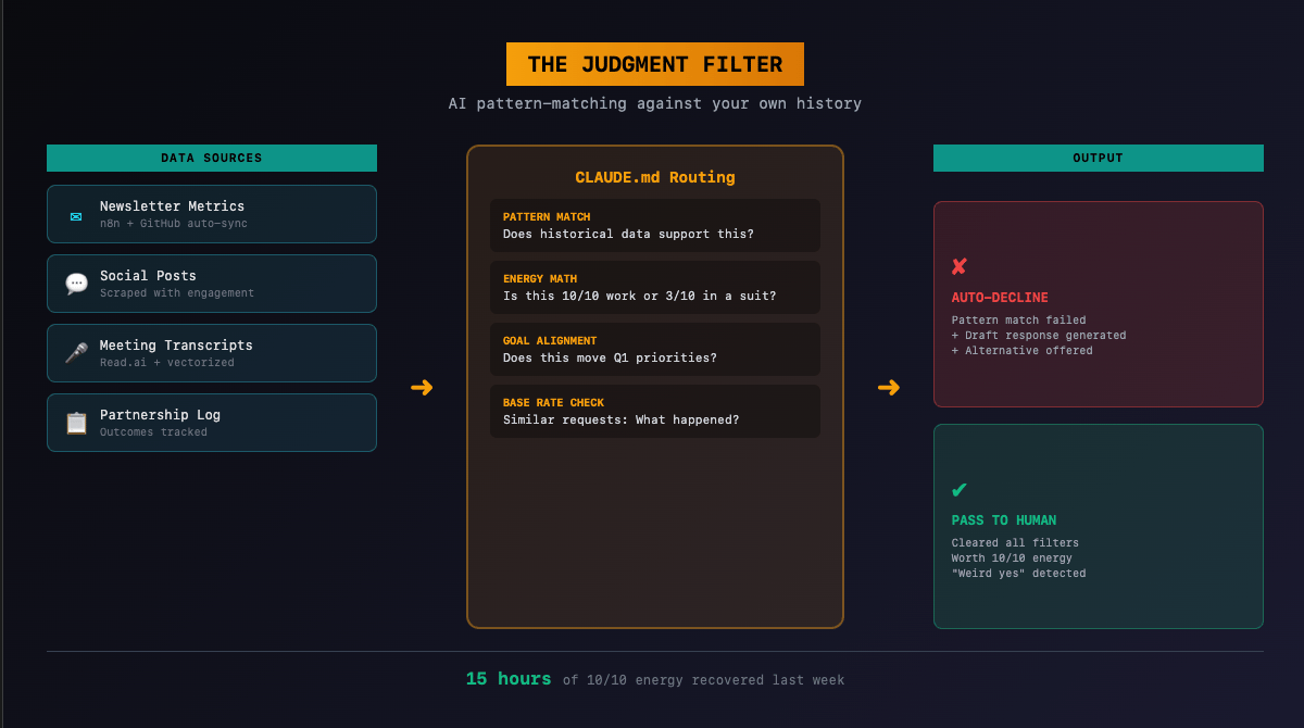 Two weeks ago, I built a system in Claude Code with access to my meeting history, content performance, and goals. It has one job: tell me what to ignore.