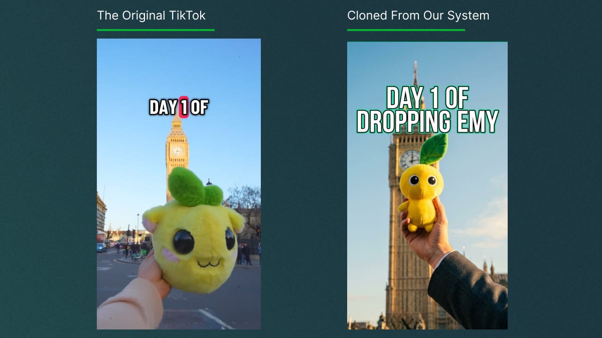You can't screenshot a viral TikTok and hand it to a designer. So founders try to shoot it themselves, ring light, bad acting, three hours for something that looks like brand content the moment it hits the feed.