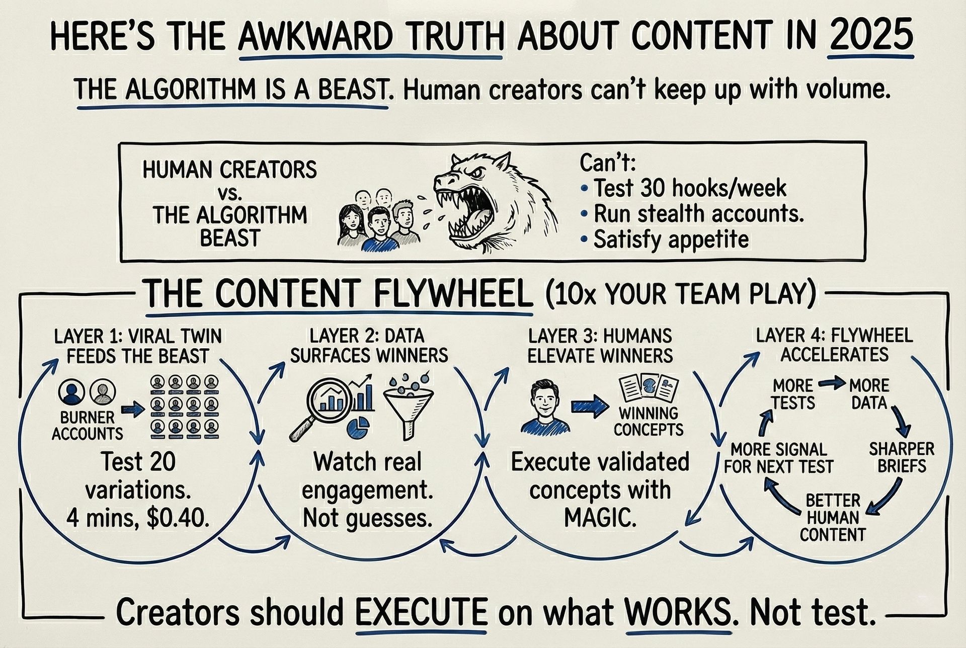 Your best creators (the ones who get it) can't test 30 hook variations per week, run stealth accounts, and feed a dozen platform formats simultaneously.