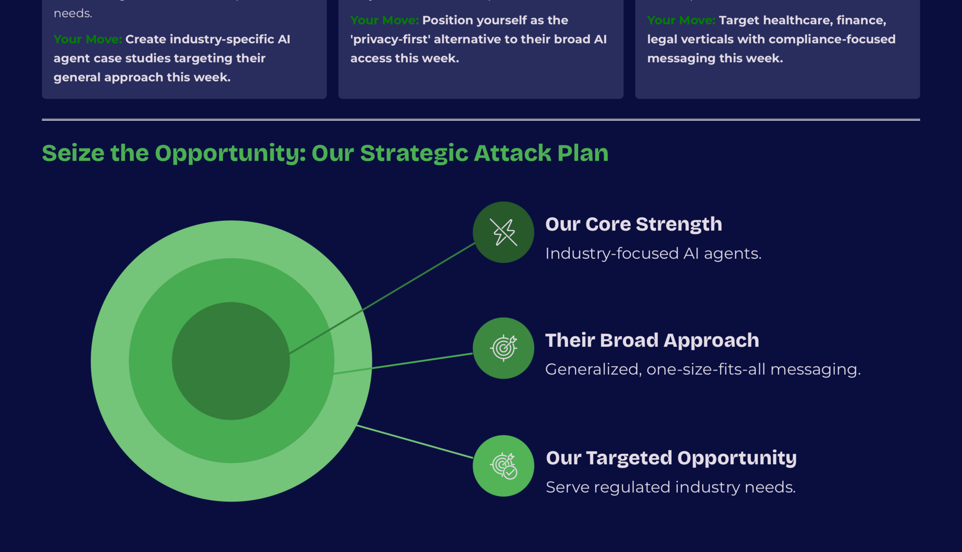 We'll run your top 3 competitors through the system live, walk through the decks together, and map out exactly where to attack.