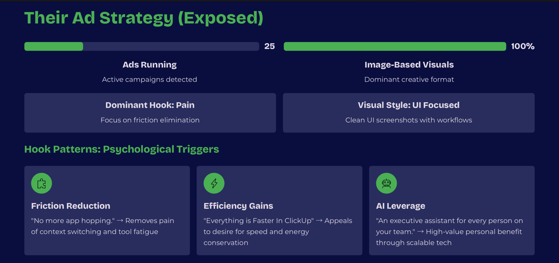 ClickUp's weak spots. Content they're not producing. Messaging angles they're ignoring. Audience segments they're leaving on the table.