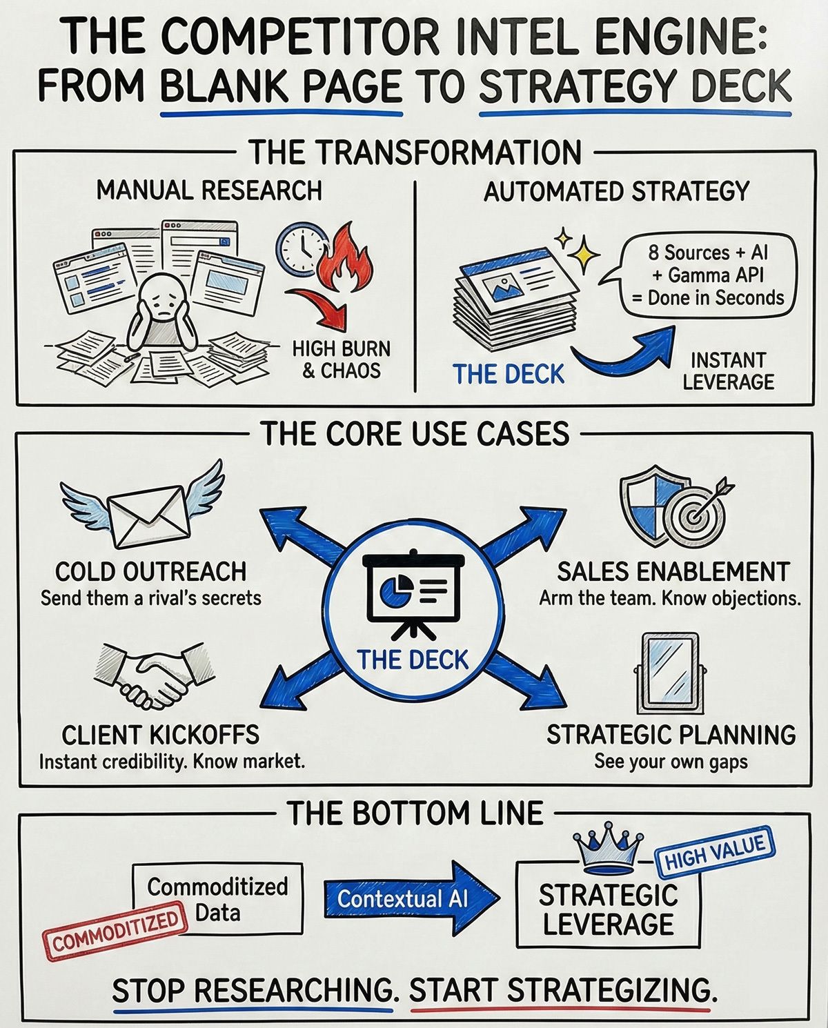 Most competitive intelligence tools make you do the work. Input their LinkedIn handle. Search Meta Ad Library manually. Pull SEO data from one tool, social from another, website copy from a third. Then synthesize it yourself.