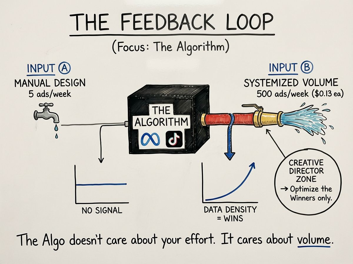 Most brands can't afford to test at the volume the algorithms demand (and I don’t have clients who pay $15k just to test). So they test 5 concepts, pray one works, and wonder why acquisition costs keeps going up.