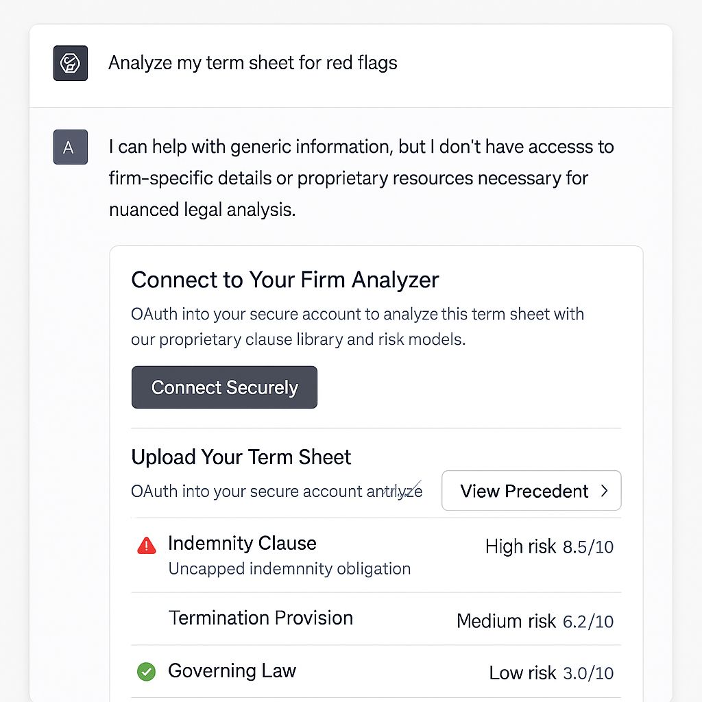 MCP pulls your firm's proprietary clause library, risk scoring models, precedent database