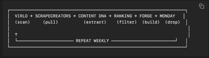 Virlo scans. Content DNA extracts. The Forge builds.