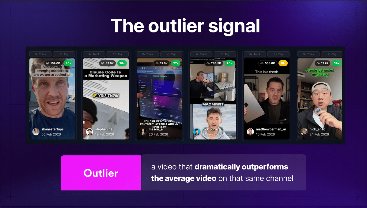 Outliers = videos that beat the creator's own average by 10x, 50x, 182x.