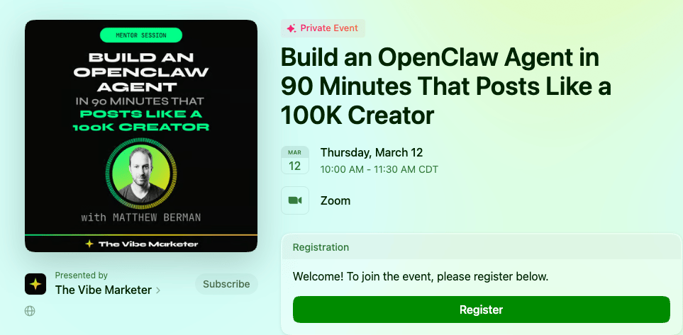 On March 12th, Boring Marketer and I are building an Openclaw agent that does the obsessive part for you (automatically, every week). And we want you to come join us. You’re going to learn how to build a killer agent from scratch.