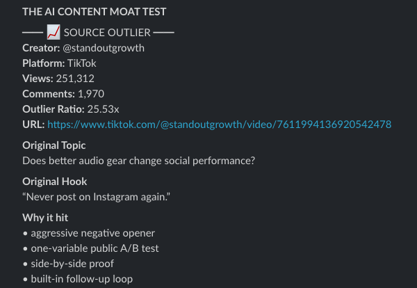 Last week it flagged a 51x outlier, a creator averaging 4,800 views, one video hit 249,000. Something about the structure of that content hit a nerve. That's what we want. Not their audience. Their blueprint.