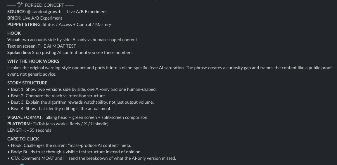 10 concepts come out the other end. Each one has the hook written, the structure mapped, the drive assigned, the traps applied. And these concepts are built on the structural DNA of content that already went viral, but adapted to sound like you.